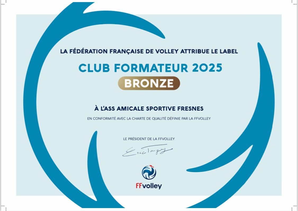 Nous sommes fiers de vous annoncer que notre club a obtenu, pour la deuxième saison consécutive, le label "Club Formateur Bronze" décerné par la Fédération Française de Volley.